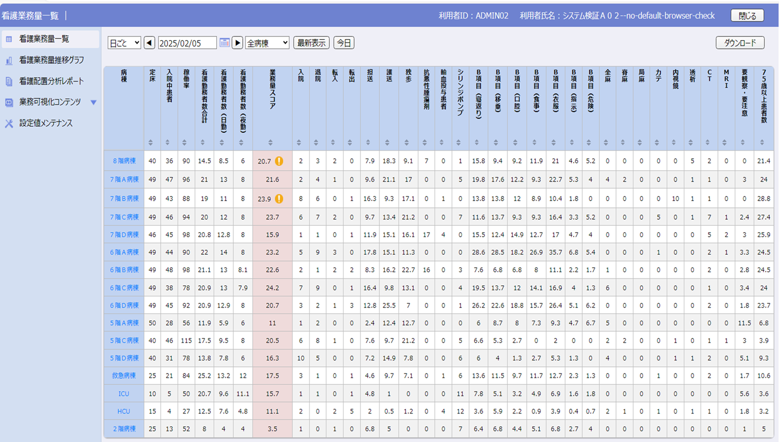 当院では2025年5月に、各部署の業務量の可視化と看護師の適正配置を目的に、「看護配置マネジメント」システムを導入しました。その機能と活用について紹介します。このシステムの主な機能として、全病棟の看護業務を一覧で示すことが可能です。「看護業務量一覧」(画像1)では、病棟ごとに、業務量スコアが勤務者合計の1.2倍になった場合、「!」が表示され、業務負荷が高いことを示します。業務量スコアの各項目は、電子カルテオーダーから紐づけられる入院・退院、治療、検査や、重症度、医療・看護必要度のB項目、管理日誌からの要注意・重症情報や年齢等で構成されています。各項目係数の重みづけは、半年かけて企業とともに評価しながら調整して設定しました。看護勤務者においては、勤務表と連携しており、新人等は0.5人換算されています。看護業務一覧は、3時間ごとに情報が更新され、日々の看護師リリーフの判断に活用できています。部署管理者にも権限を付与し、情報を可視化しています。一方で、各勤務帯の看護師人数による業務負荷の表示ではないことや、看護補助者の配置は反映されていない等の課題があり、受け持ち分担表と併せて判断しています。