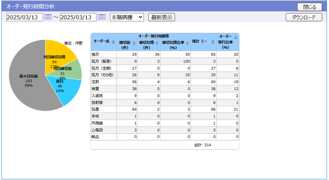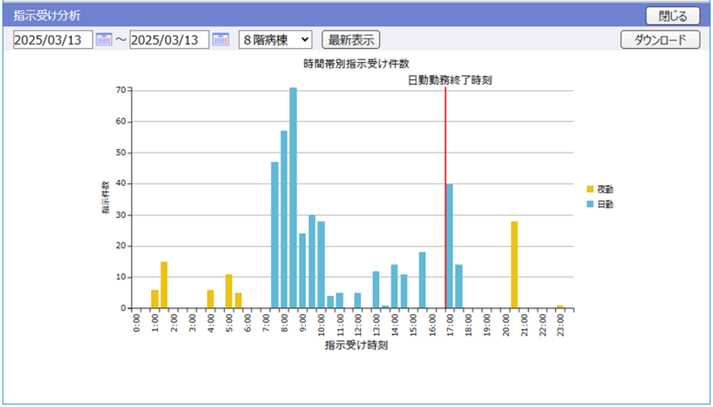その他、曜日ごとの業務量推移や看護配置分析レポート、オーダー発行時間(画像2)や指示受け分析(画像3)等も可視化されるため、各部署で看護配置の検討や、業務改善に活用することができます。今後の課題は、これらのシステムを活用した業務改善や働き方改革のマネジメントを行い、変革することです。