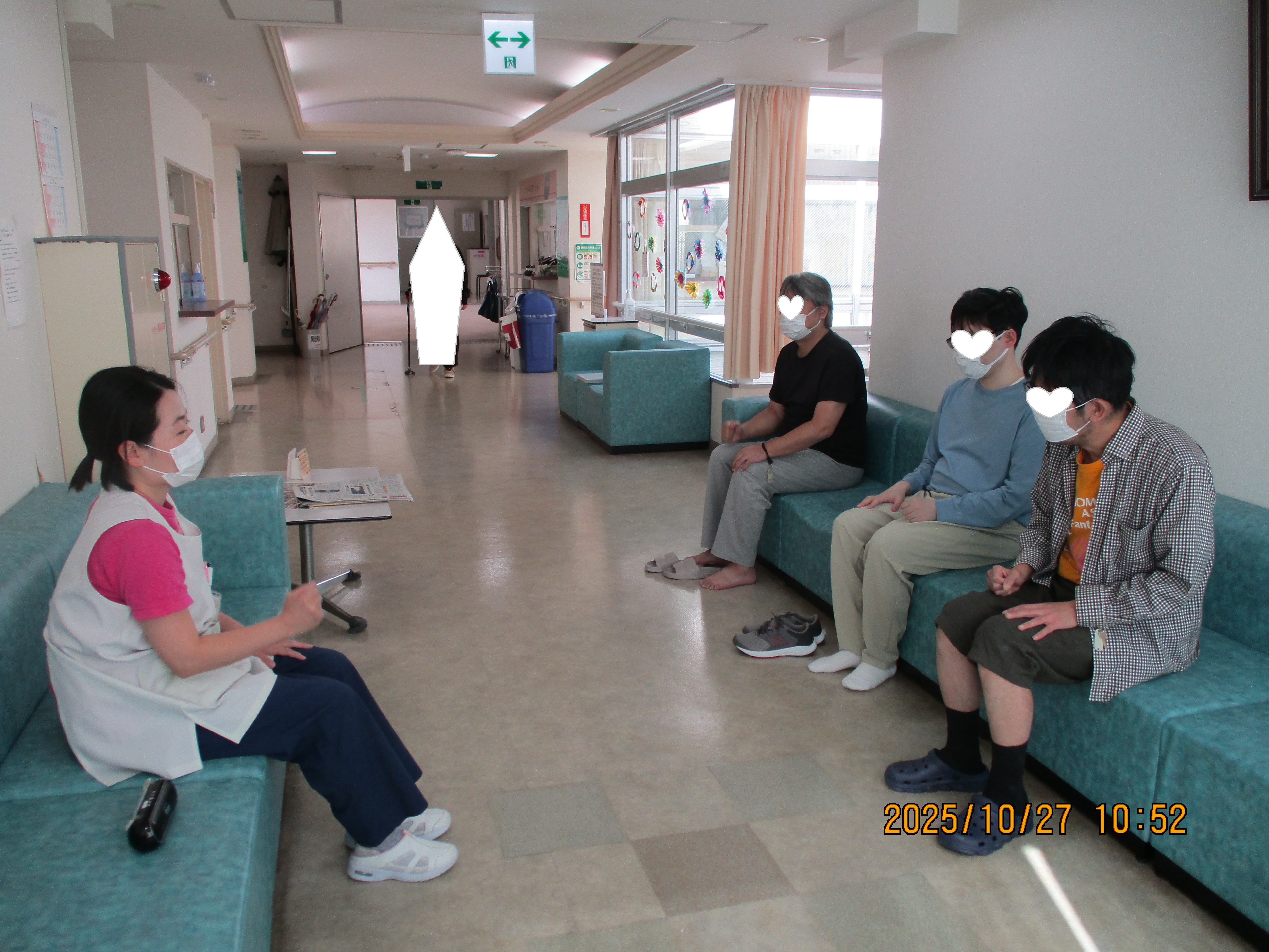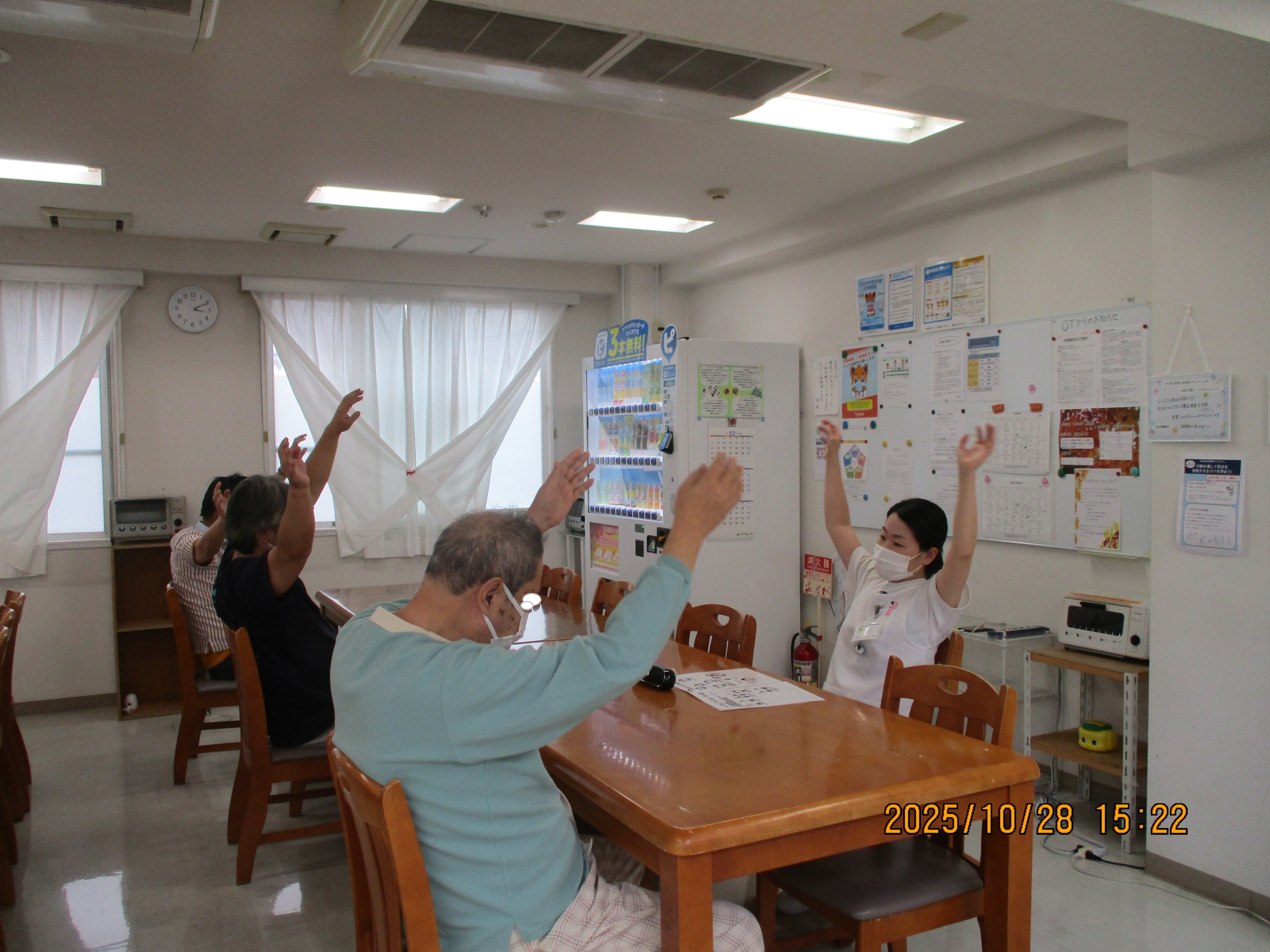 場所は病棟内、午前中は足、午後は手の体操を一回に10分間、音楽を流しながら看護助手の誘導で行います。 無理のないように椅子に腰かけて行います。